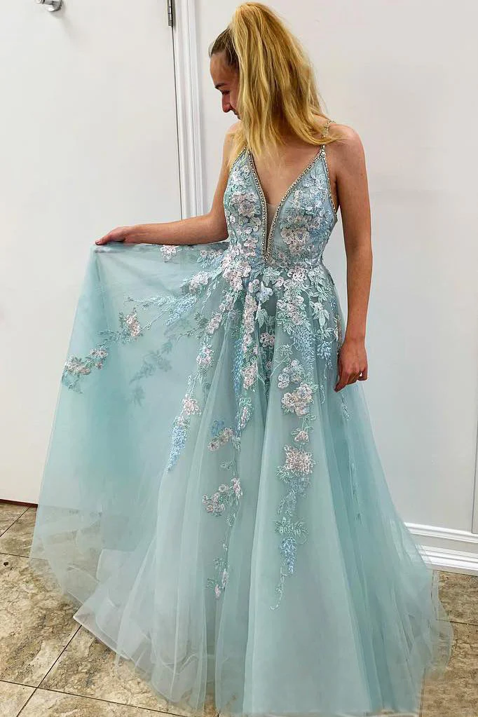 Charming Spaghetti Straps V Neck Sleeveless Tulle Mint Prom Dress with Beading OKY78