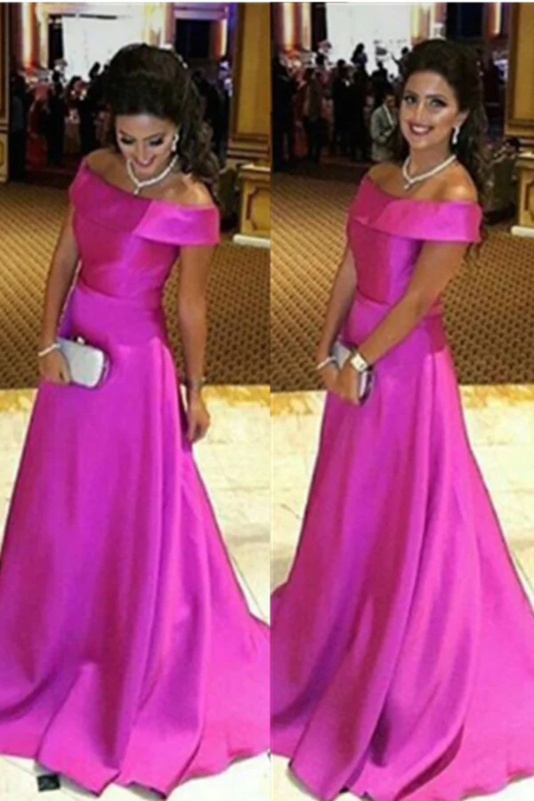 • Hot Pink Off Shoulder Formal High Low Simple Satin Long Prom Dress K667