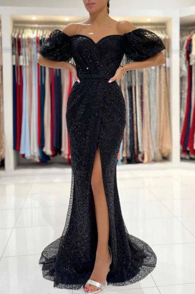 • Mermaid Black Off the Shoulder Sequined Slit Long Prom Dress. Formal Evening Dress OK1193