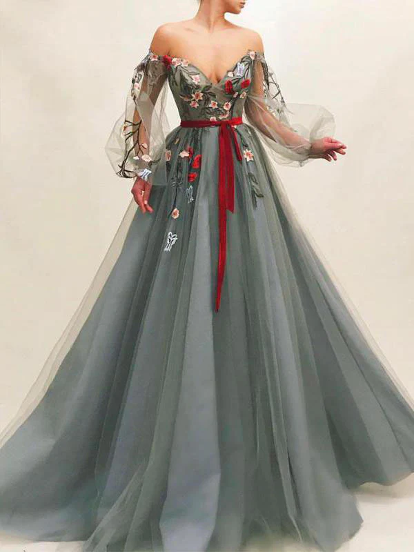• Off The Shoulder Long Sleeves A Line Tulle Long Prom Dress With Flowers OK1080