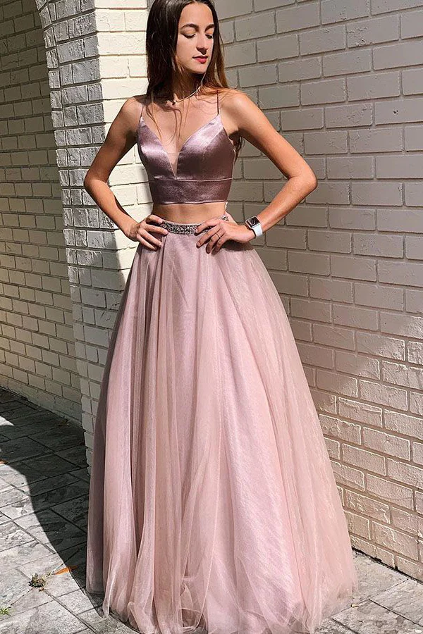 • Sexy Spaghetti Straps Two Piece Tulle A-line Pink Prom Dress With Beading OKZ88